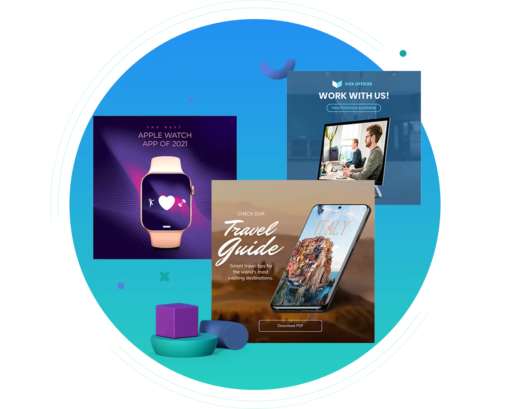 - Three print media items (e.g., flyer, poster, brochure)